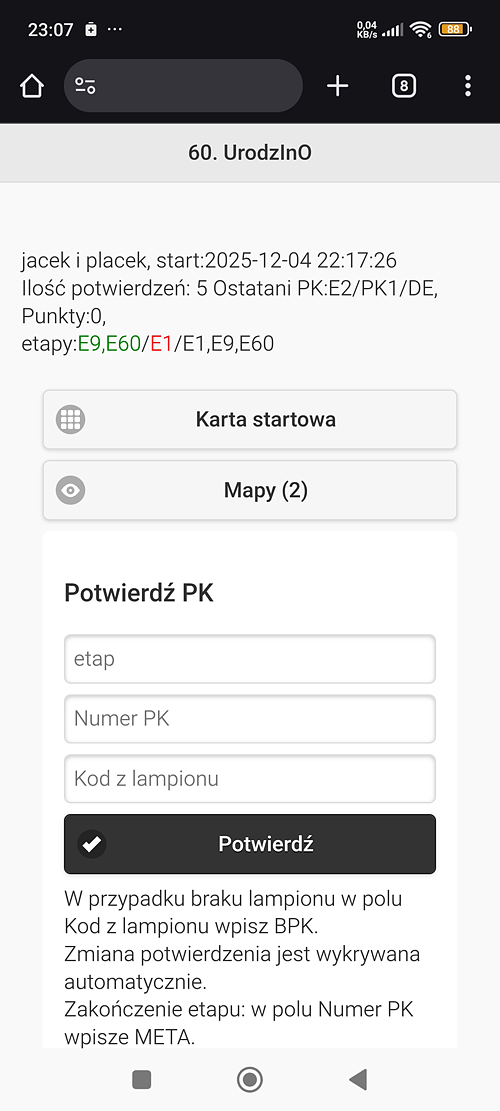 Dokładnie tak. QR na starcie, lampiony wpisujemy „z ręki”, meta w dowolnej chwili (nie trzeba być na niej fizycznie ale lokalizacja lampionu gdzie jest zaznaczona meta może być przydatna).